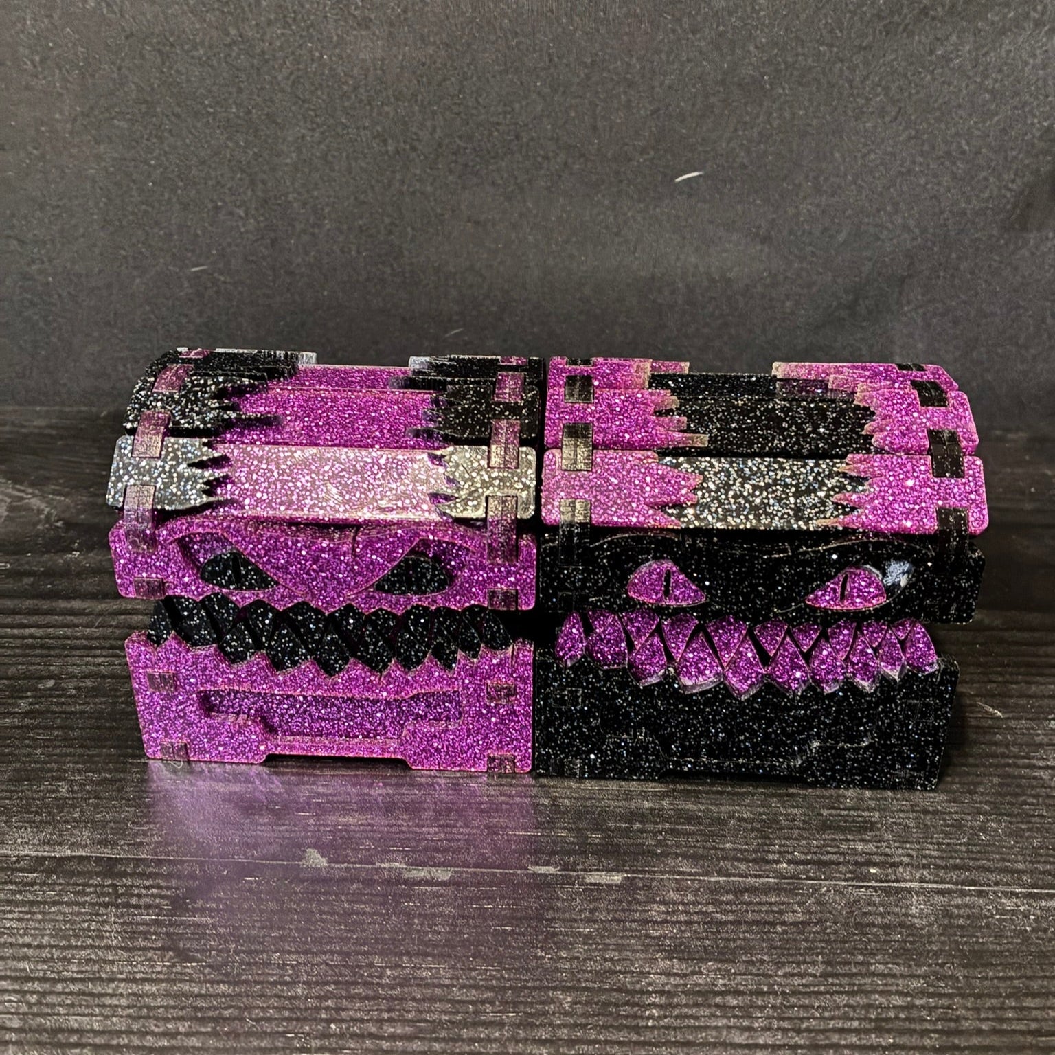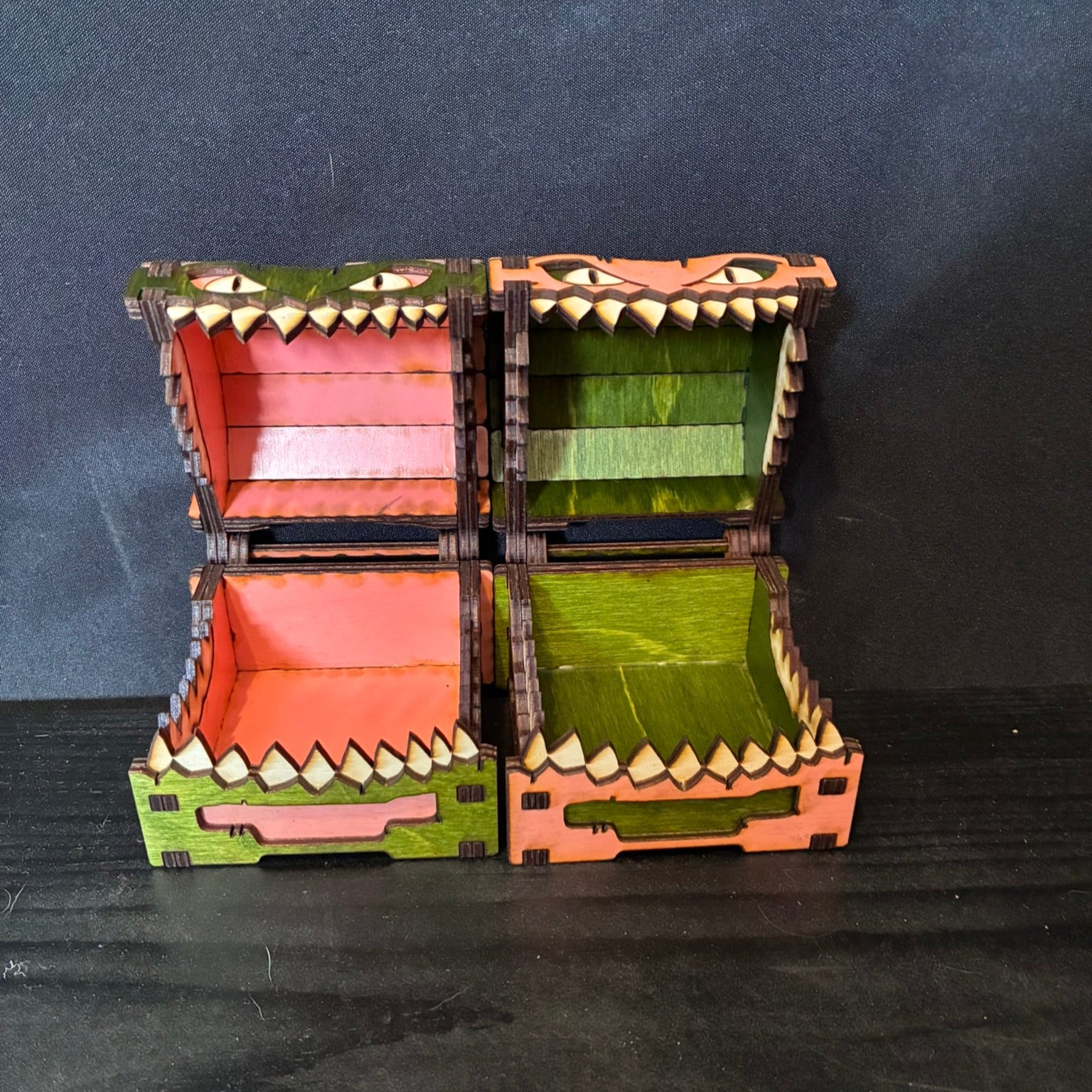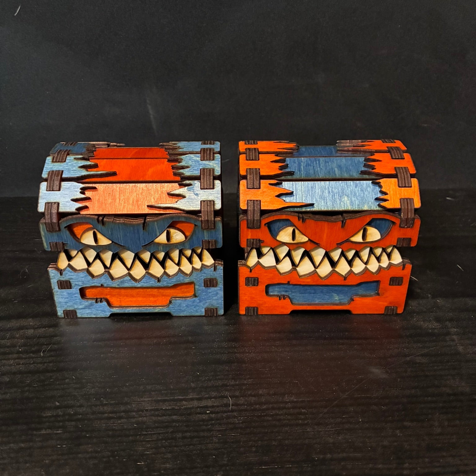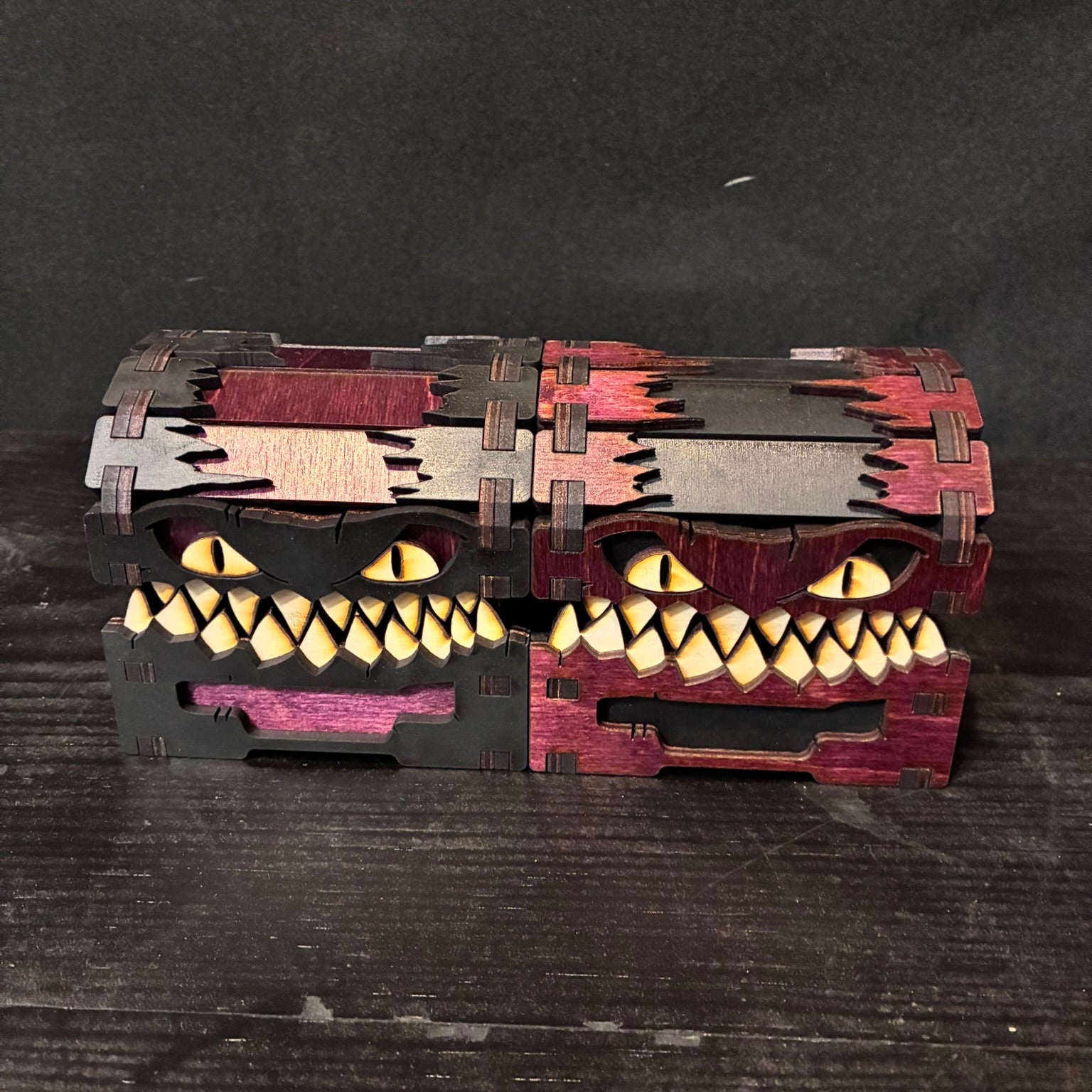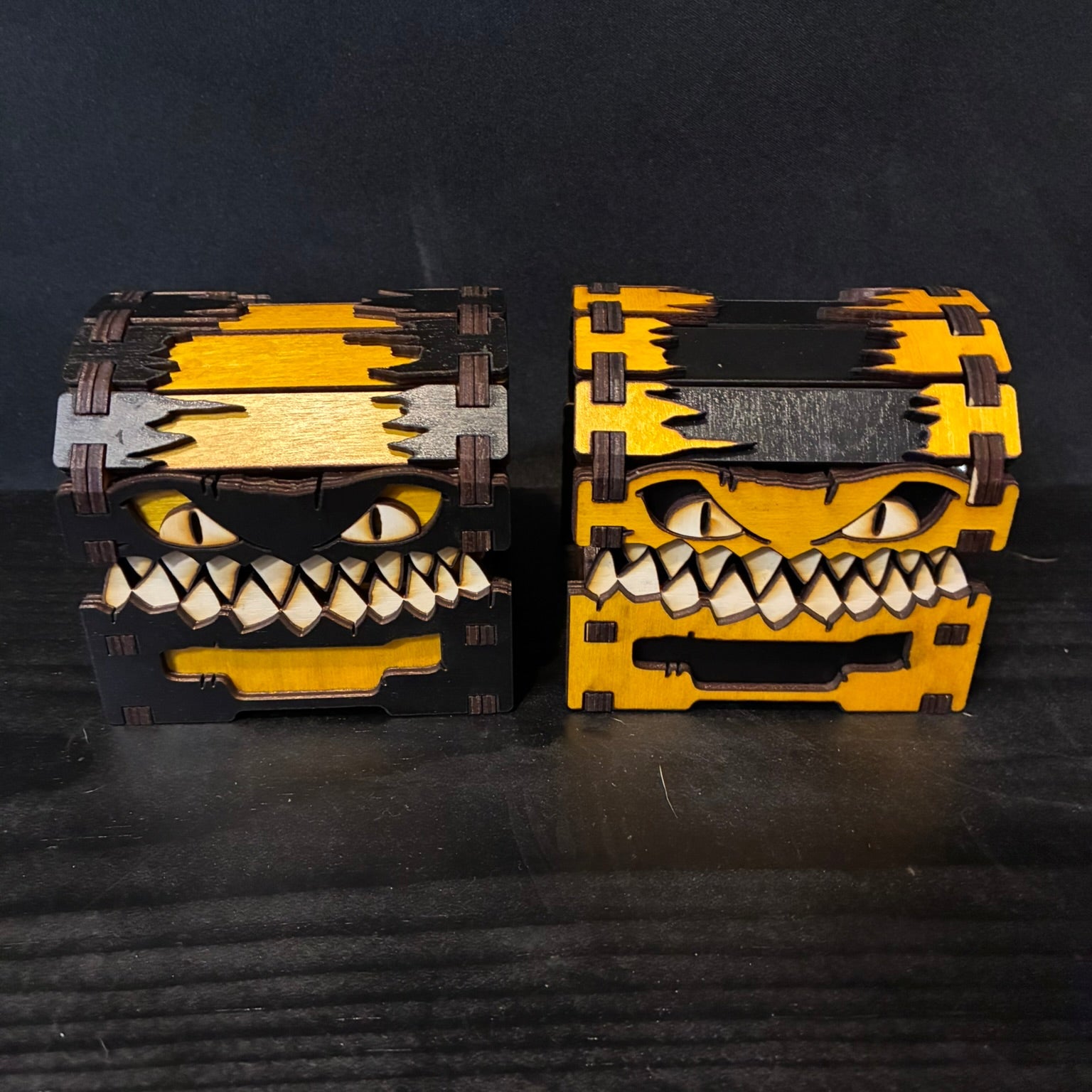 This mimic may be small, but it’s full of personality! Whether you prefer the rich texture of stained wood or the gleam of colored acrylic, your new mimic chest is ready to guard your dice, trinkets, or tiny treasures with toothy charm.