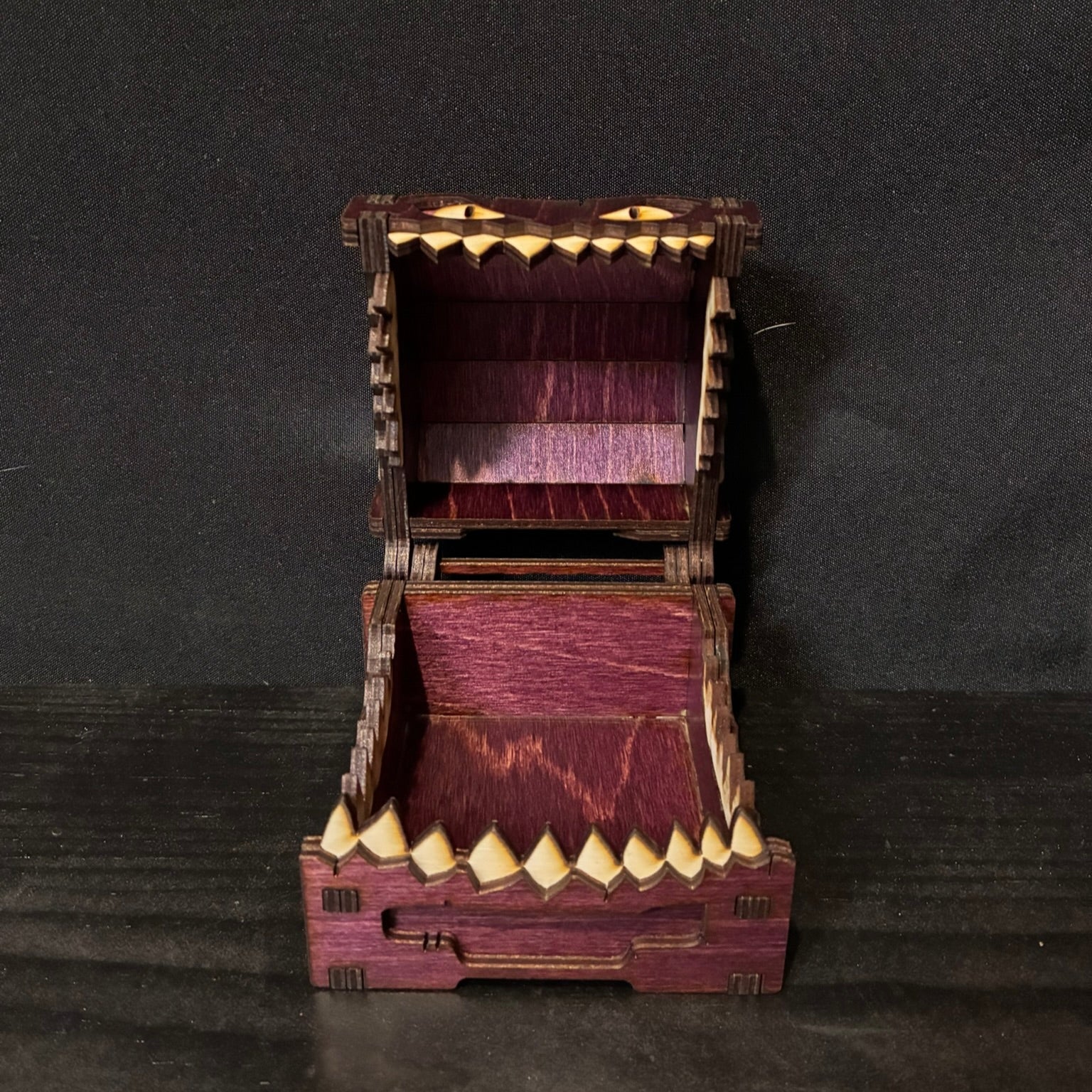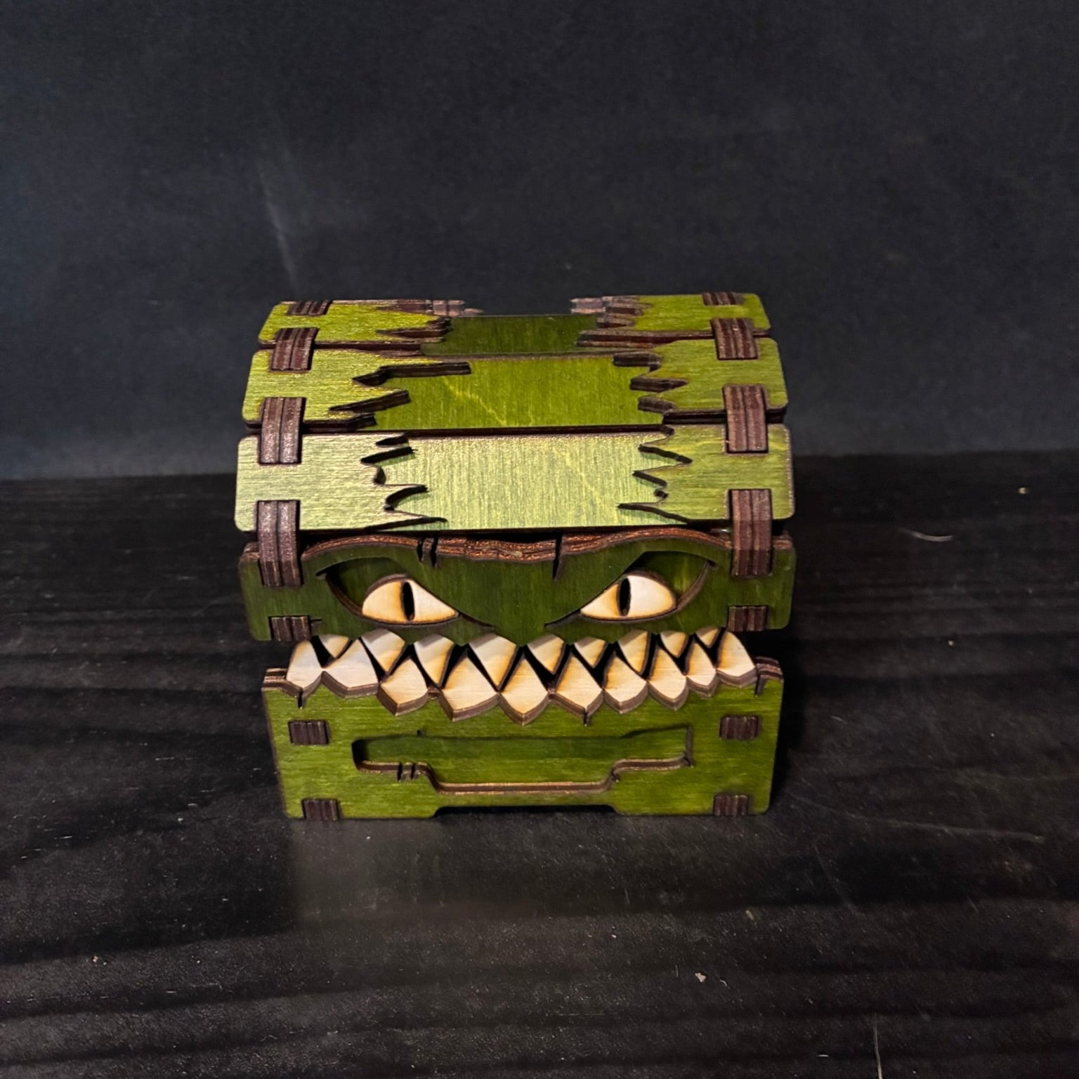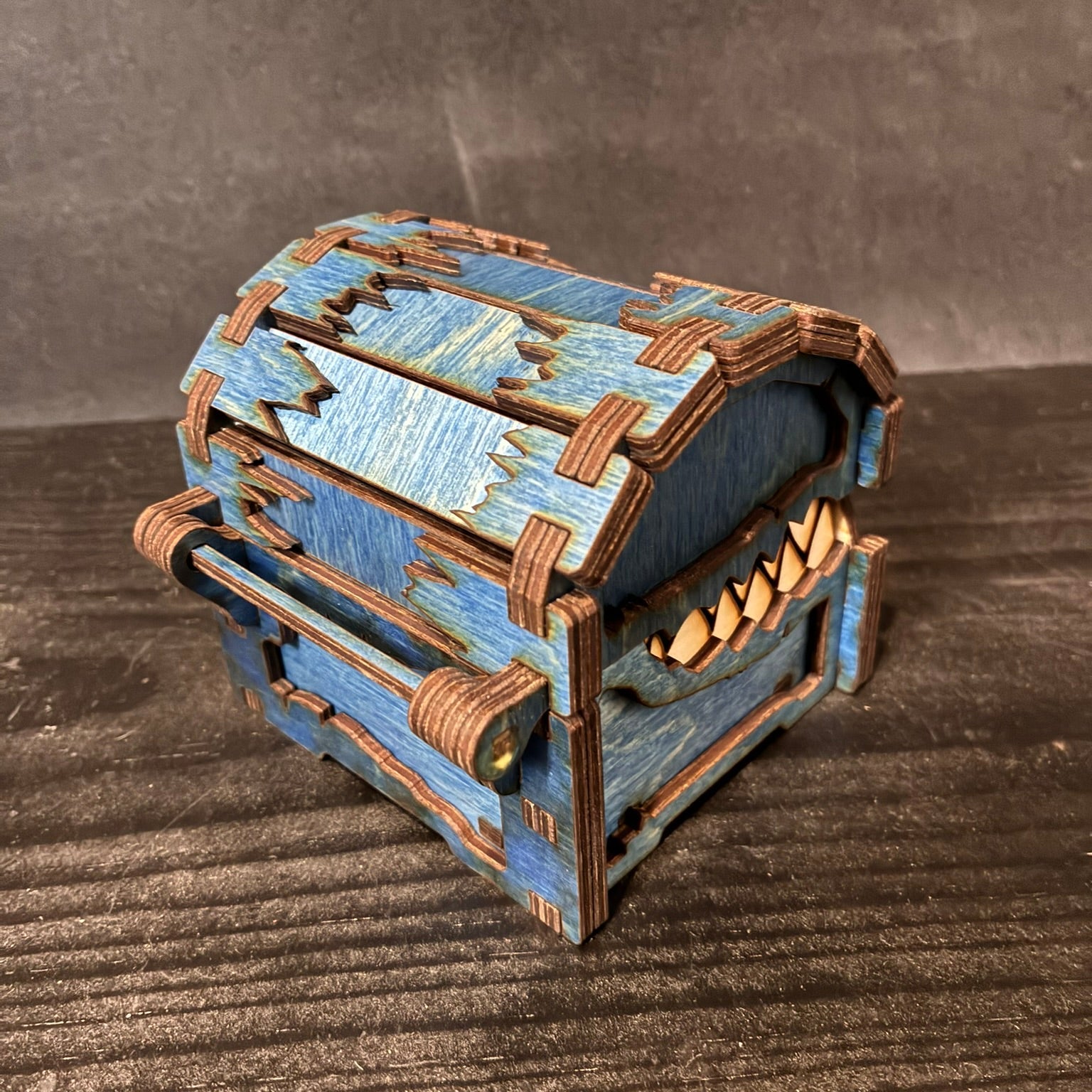 Add a touch of fantasy to your desk, shelf, or game night with our Small Mimic Chest, a handcrafted treasure box made right here in our shop. Each one is precision laser cut from premium stained wood and assembled by hand for a one-of-a-kind finish that brings your mimic to life.